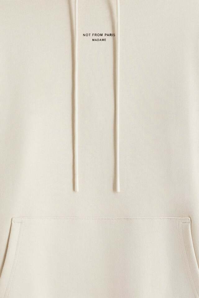 Le sweat à capuche en tissu éponge français 100 % coton est orné du slogan « Not From Paris Madame » sur le devant. Il est doté d’une capuche à cordon de serrage avec pointes cirées, d’une poche kangourou sur le devant, d’un ourlet et de poignets côtés.
