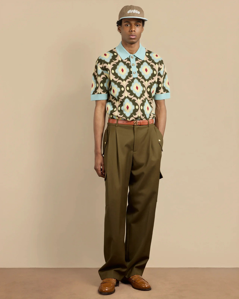 Polo manches courtes kaki en maille jacquard 100% laine mérinos. Orné du motif Tapisserie, il présente une patte de boutonnage à trois boutons. Le col, les bas de manches et le bas de corps sont en bord-côte contrasté.
