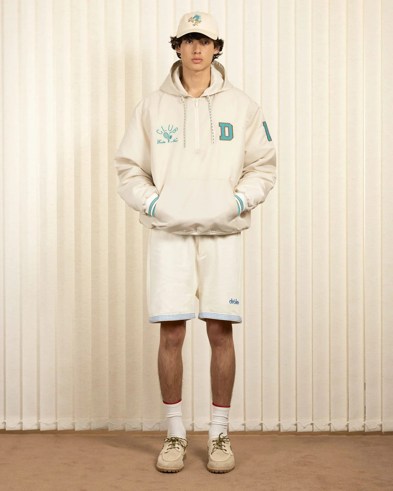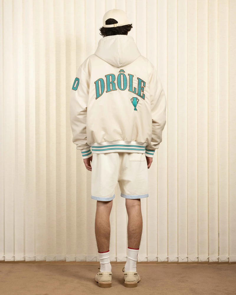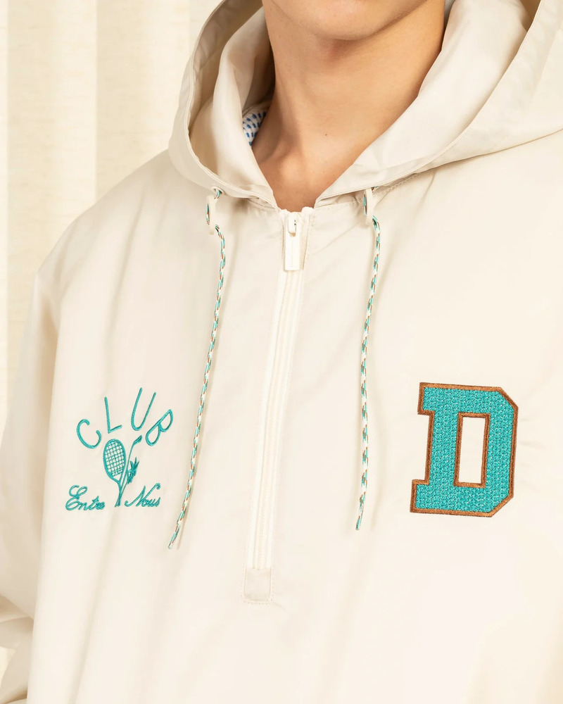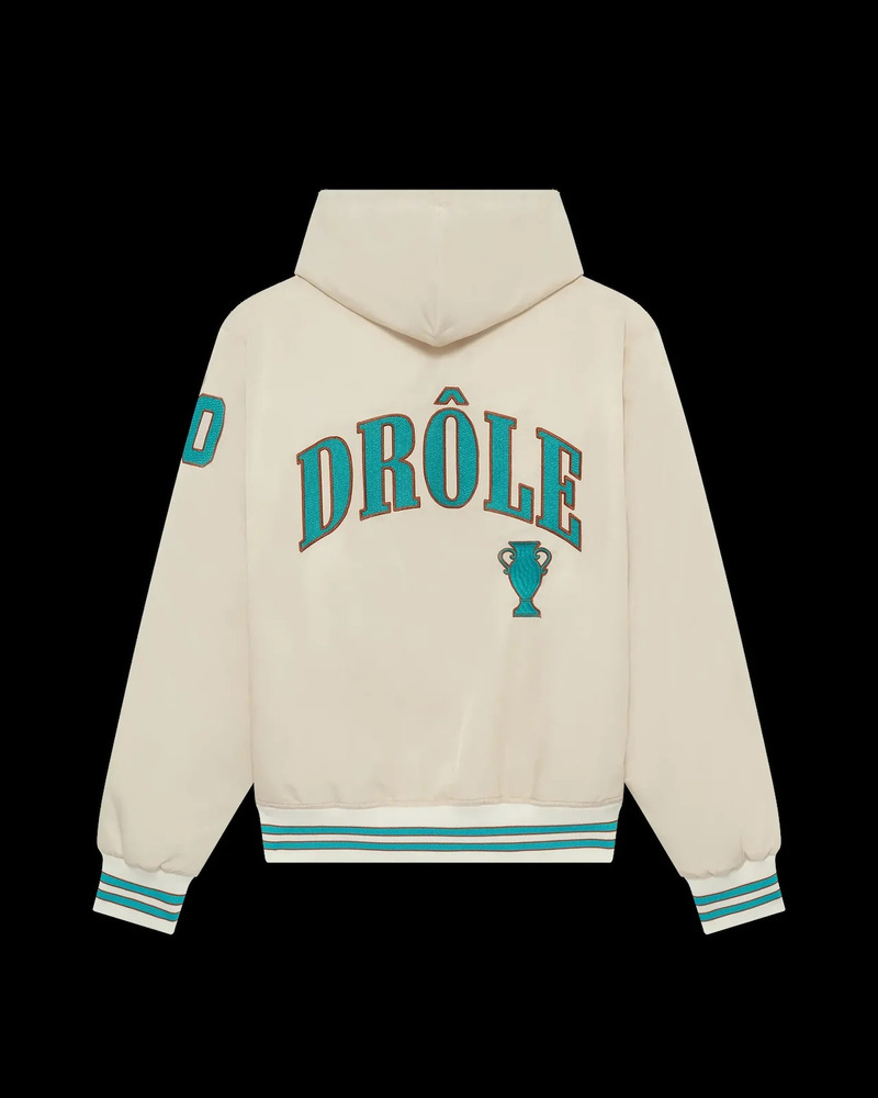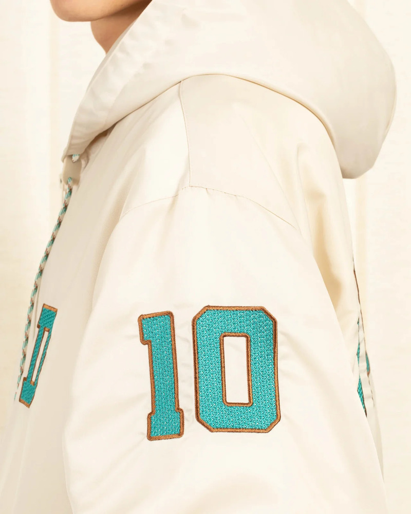 Cette veste de type vareuse en beige possède des ornements brodés sur les bras, la zone thoracique et l’arrière. Il inclut une capuche ajustable par cordon, une poche kangourou, une fermeture éclair et des bords côtelés.