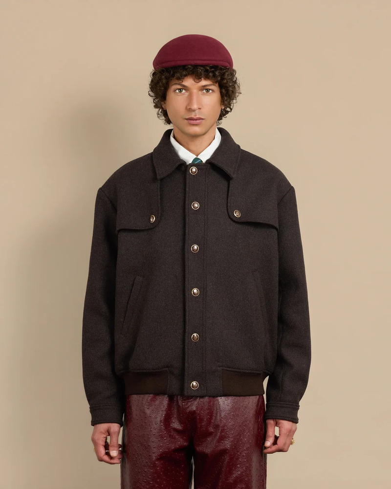 Blouson marron en laine mélangée avec col amovible en mérinos.