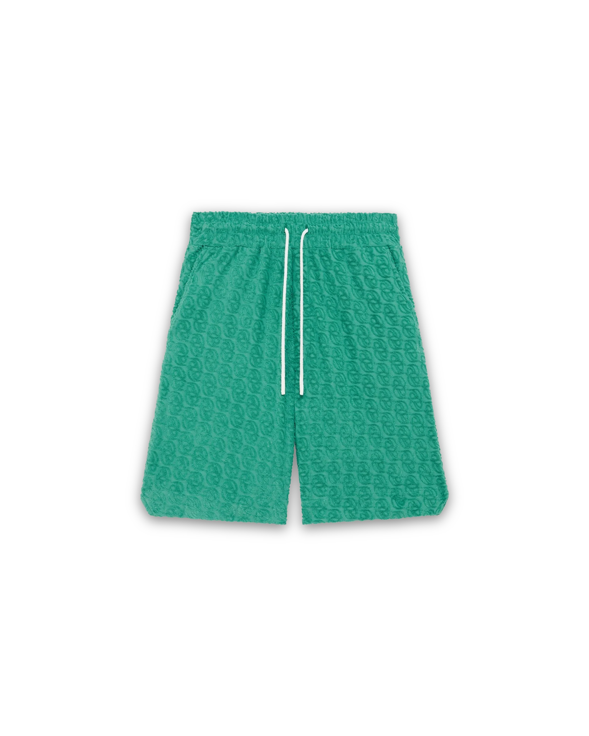 Ce short vert émeraude en éponge entièrement en coton arbore un jacquard à motifs « D » réfléchissants. Il présente une taille élastique rehaussée d’un cordon de serrage et deux poches en style italien.