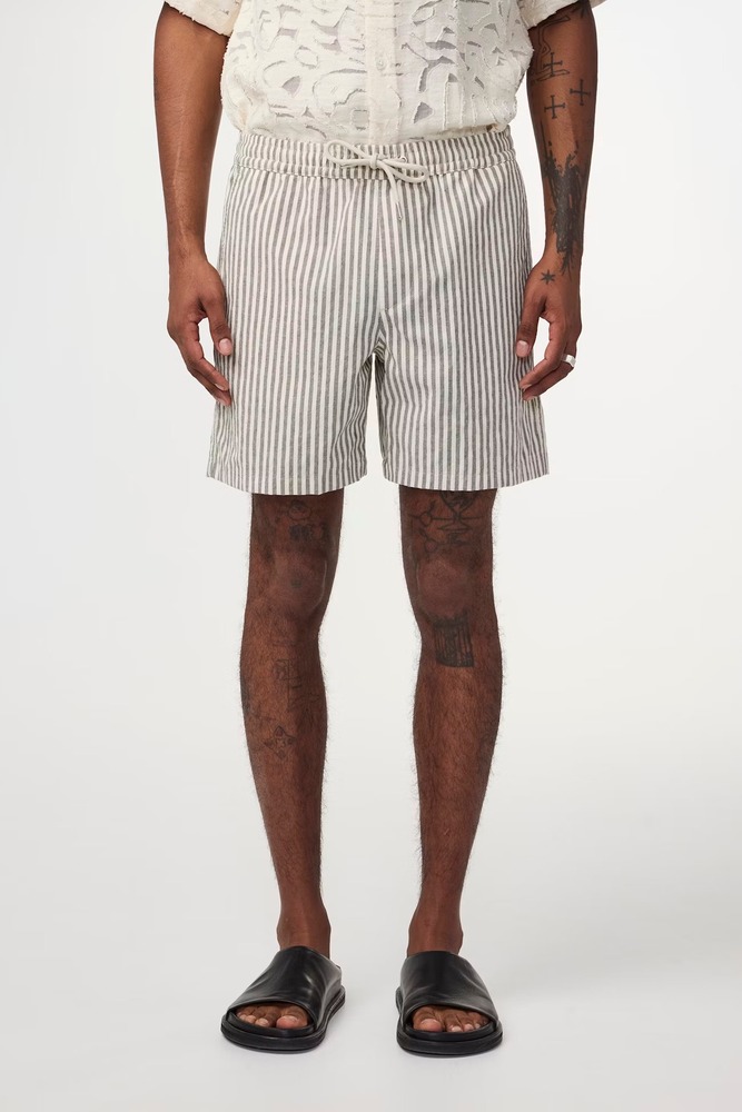 Un short intemporel muni d’un cordon de serrage, réalisé dans un tissu de coton doux, doté d’une taille élastique et