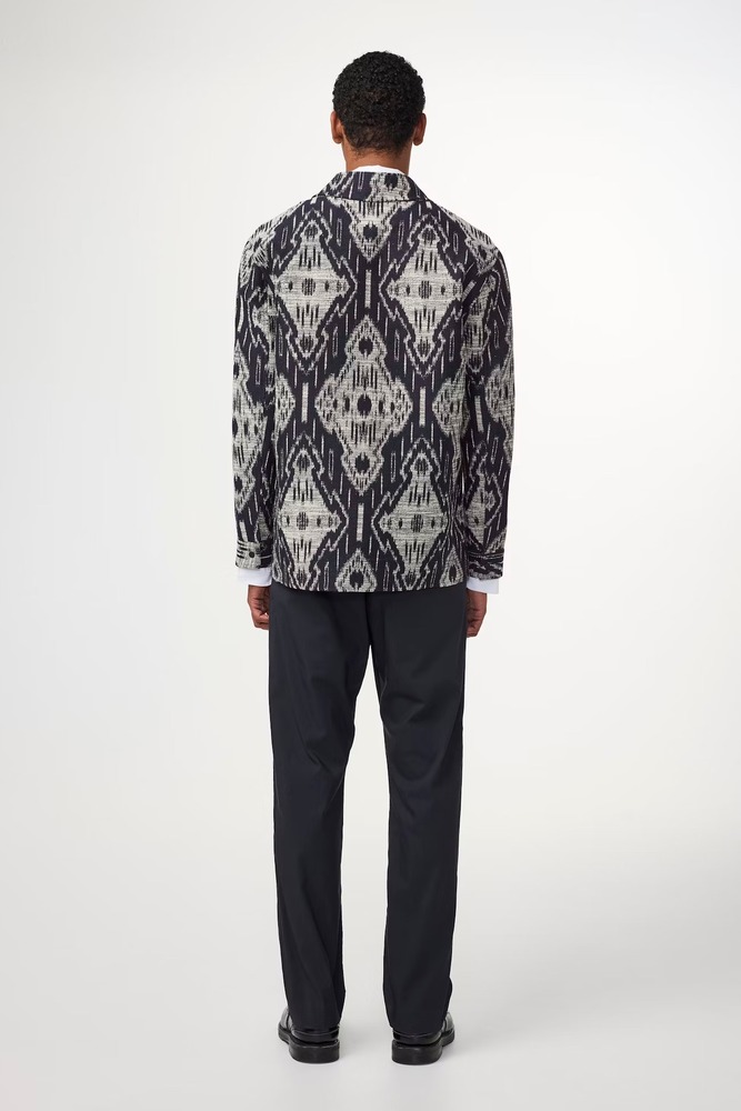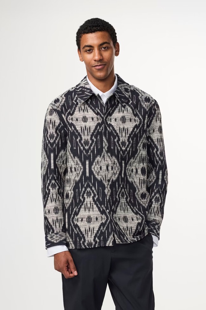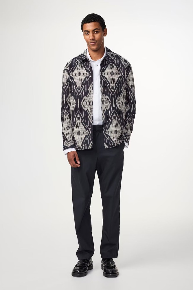 Surchemise épurée réalisée avec une combinaison de coton en jacquard, dotée de boutons-pression métalliques portant le logo et d’une seule poche au niveau de la poitrine.