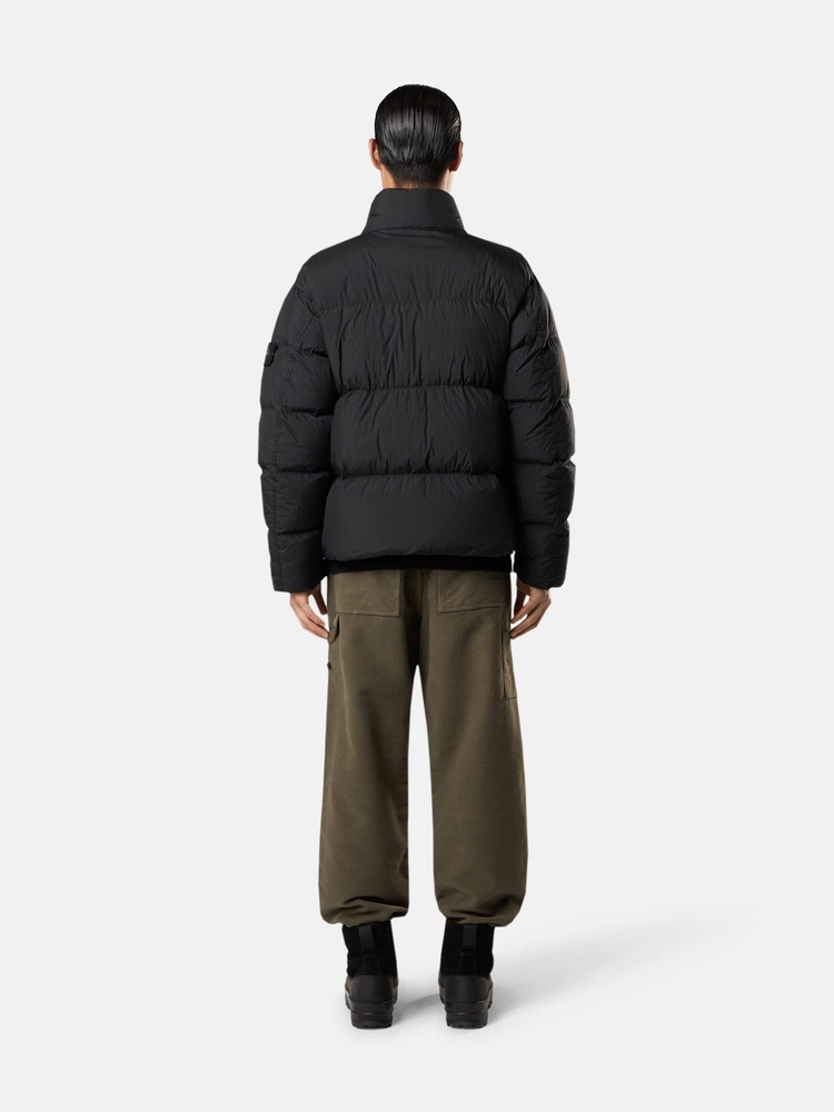 Doudoune réalisée en nylon reps recyclé léger au tissage très serré. Sa face intérieure est enduite d’une résine, offrant une protection efficace contre le vent et une résistance modérée à l’eau. Ce traitement particulier entraîne une pénétration irrégulière de la teinture, donnant à la surface un effet froissé distinctif. Le rembourrage est composé de plumes ultra-fines spécialement traitées pour supporter le processus de teinture en pièce. Ce modèle est certifié RDS (Responsible Down Standard), garantissant le respect des normes de bien-être animal.